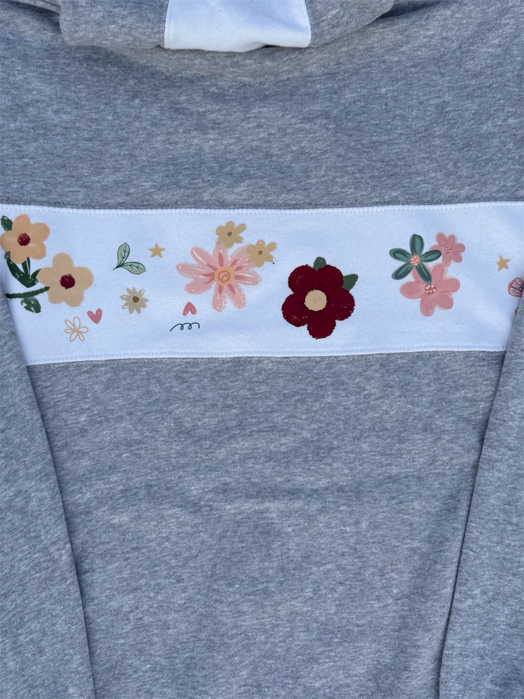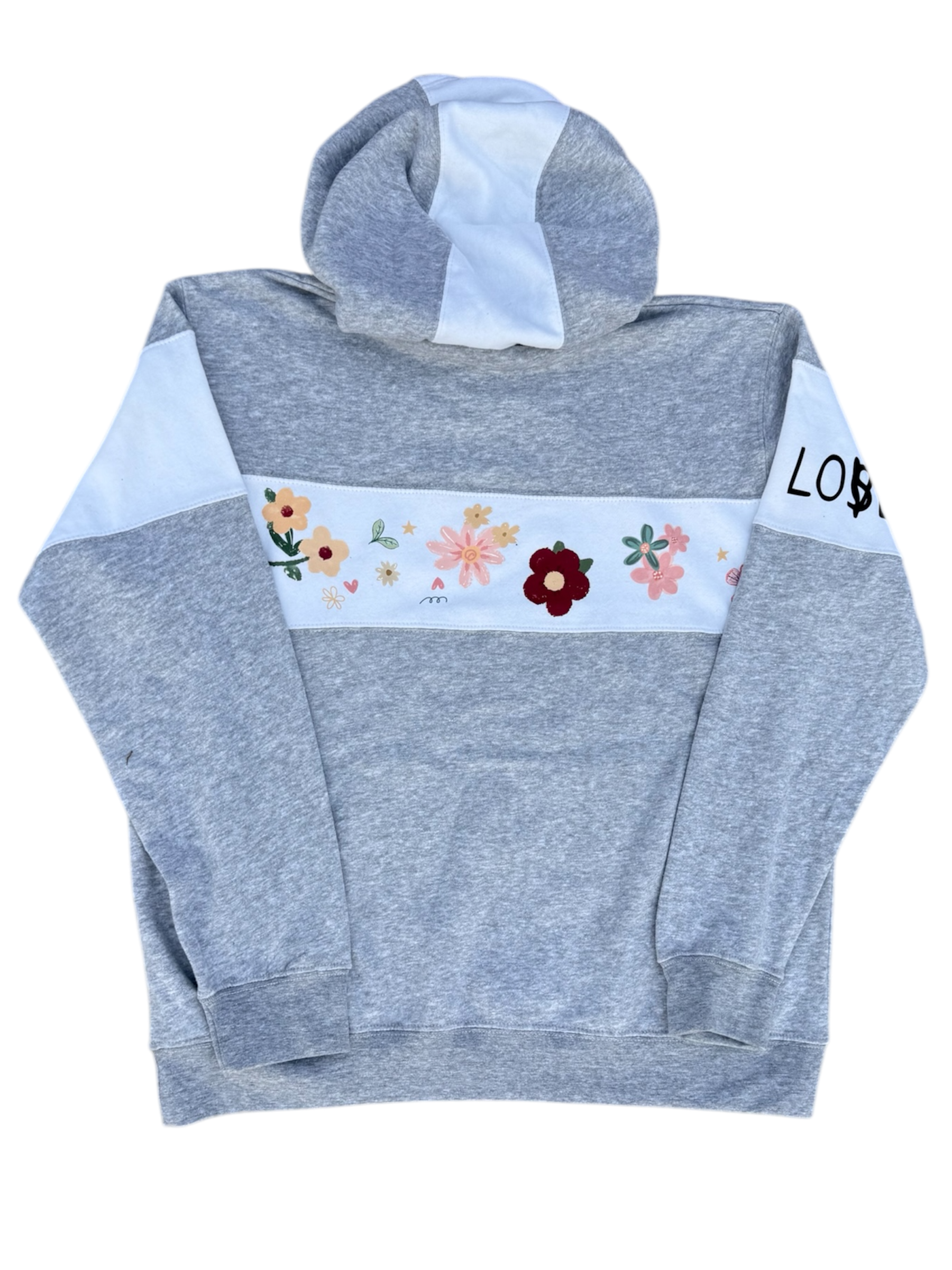 This hand stitched hoodie is comfy and relaxable, with pretty floral flowers pressed on