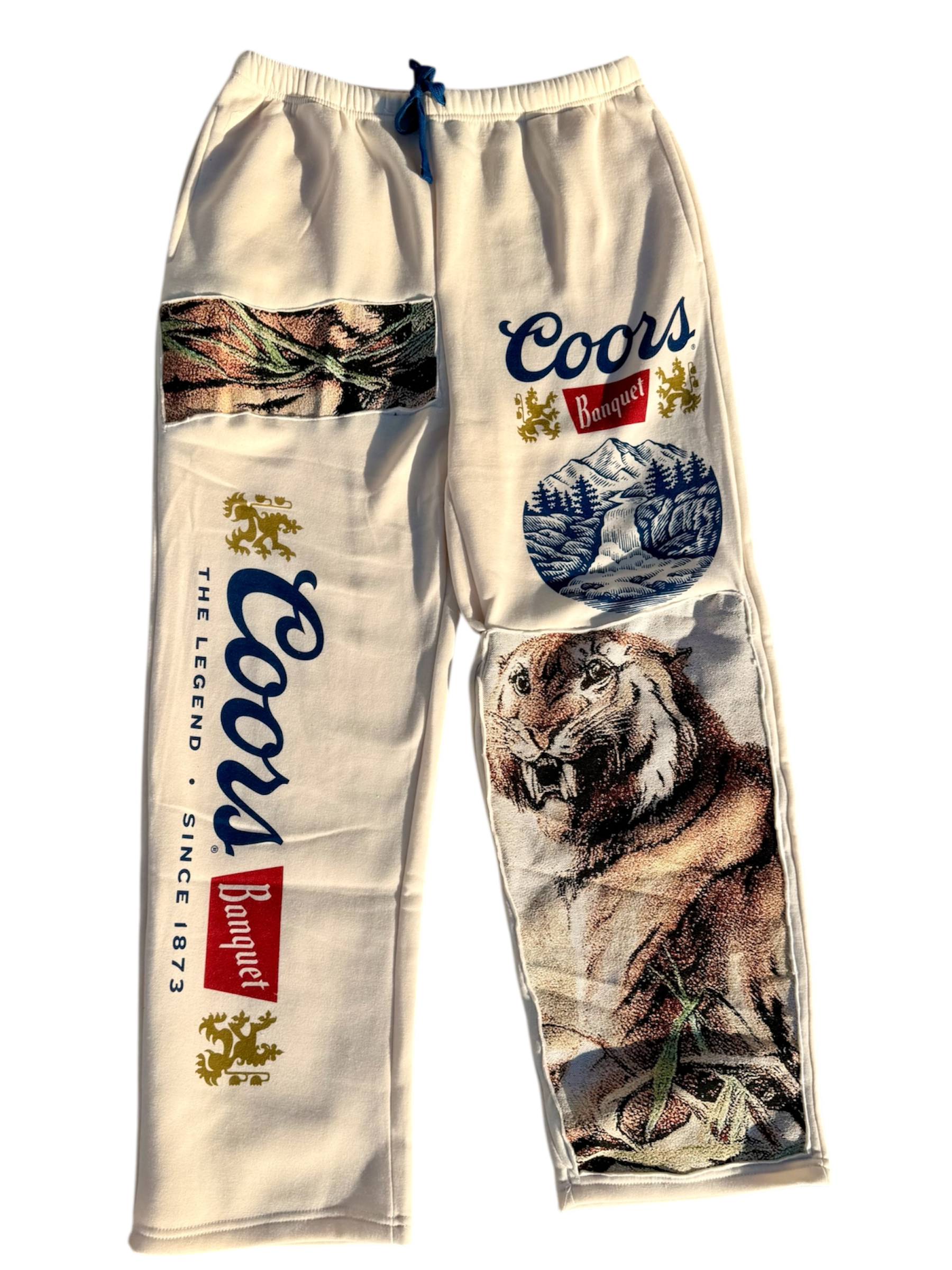 White Coors Banquet sweatpants with some custom hand made stitching to add more authenticity to them.